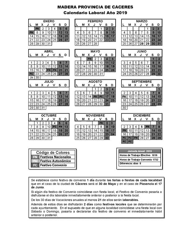 Resolución de 14 de enero de 2019, de la Dirección General de Trabajo, por la que se ordena la inscripción en el Registro de Convenios y Acuerdos Colectivos de Trabajo de la Comunidad Autónoma de Extremadura y se dispone la publicación del Acta, de fecha 3 de diciembre de 2018, suscrita por los miembros integrantes de la Comisión Negociadora del "Convenio Colectivo para las Industrias de la Madera para la provincia de Cáceres 2018-2019" en la que se establece el calendario laboral para el año 2019 aplicable en el ámbito de actuación del citado convenio