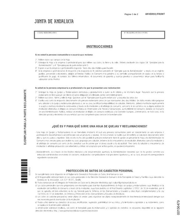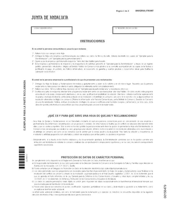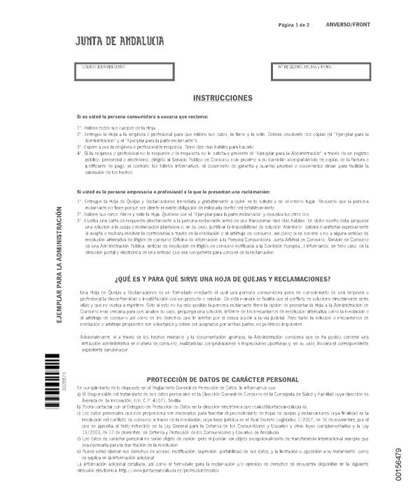 Base de Datos de Legislación Decreto 472/2019, de 28 de mayo, por el que se regulan las hojas de quejas y reclamaciones de las personas consumidoras y usuarias en Andalucía y su tramitación administrativaFichaVersiones/revisionesFicha:ÓrganoCONSEJERÍA DE SALUD Y FAMILIAS Publicado en BOJA núm. 104 de 03 de Junio de 2019Vigencia desde 03 de Diciembre de 2019Versiones/revisiones: