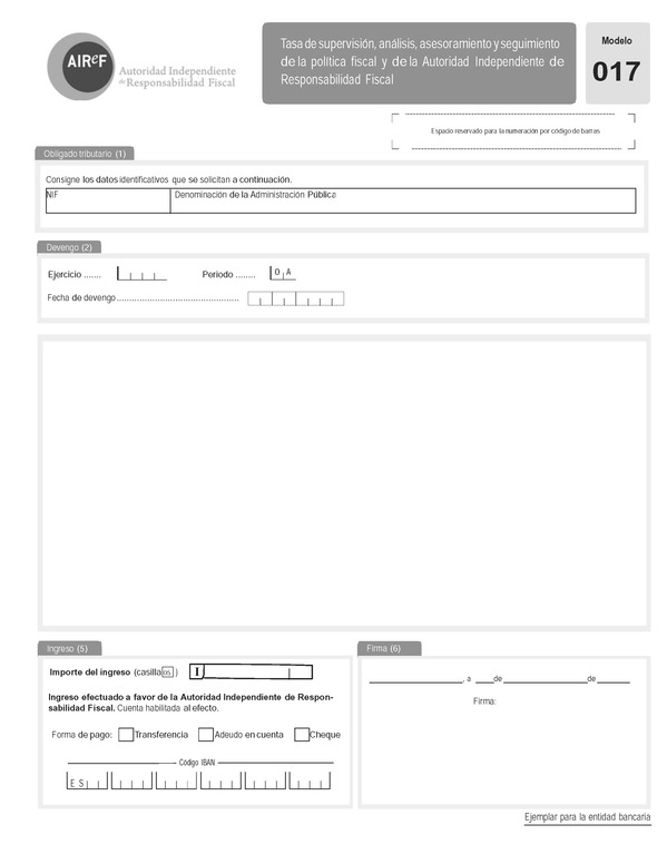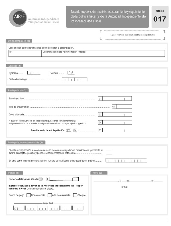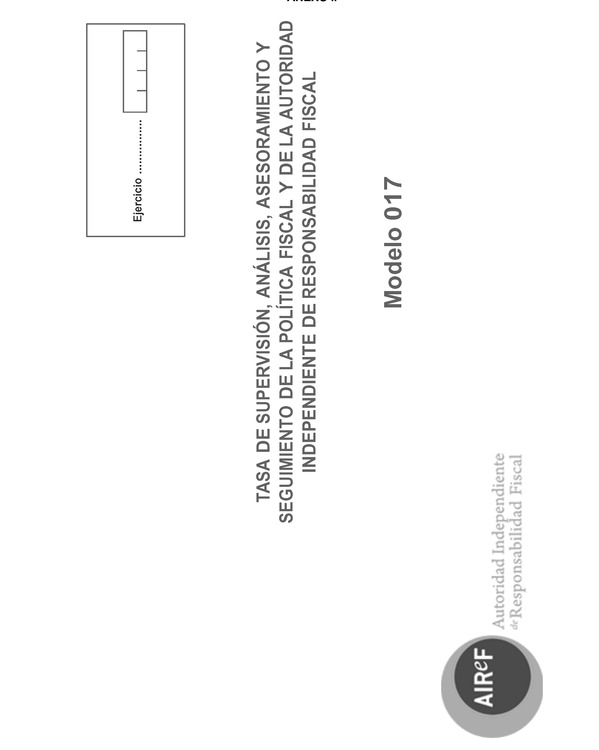 Base de Datos de Legislación Atención norma derogada, ver regulación posteriorOrden HAP/1286/2014, de 14 de julio, por la que se aprueba el modelo 017, «Tasa de supervisión, análisis, asesoramiento y seguimiento de la política fiscal. Autoliquidación» y se determinan el lugar, plazo y forma de presentaciónFichaVersiones/revisionesFicha:ÓrganoMinisterio de Hacienda y Administraciones PublicasPublicado en BOE núm. 176 de 21 de Julio de 2014Vigencia desde 22 de Julio de 2014. Revisión vigente desde 22 de Julio de 2014Versiones/revisiones: