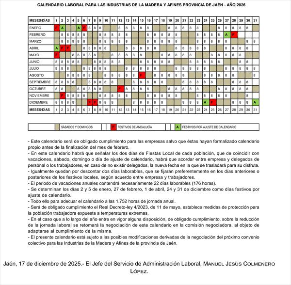 Base de Datos de Legislación Convenio colectivo de trabajo para las Industrias de la Madera y afines de la provincia de Jaén. Calendario laboral para 2026FichaVersiones/revisionesFicha:ÓrganoConsejería de Empleo, Empresa y Trabajo AutónomoPublicado en Vigencia desde 01 de Enero de 2026Versiones/revisiones: